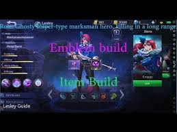 Tips Item build, emblem, and Spell Lesley - Lesley is one of hero protect Mobile Legends: Bang Bang (MLBB), which was a mainstay of long-range attacks. Has Competencies Activation and attack critical on Competencies passive.. Lesley is often referred to as Para. used player Mobile legends to have damage which is very great and very useful when Team fight. ...