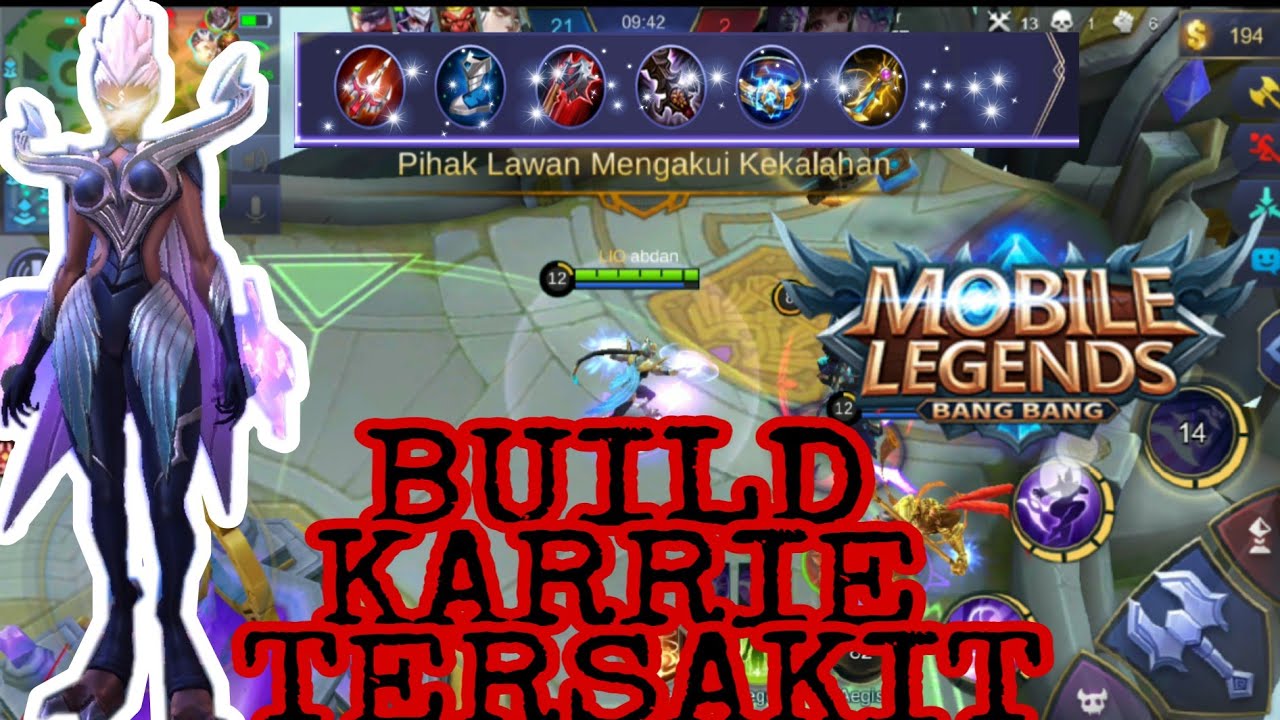Karrie sendiri merupakan hero Marksman yang dikenal dapat menghancurkan pertahanan hero Tank sekalipun. Tidak hanya build item, kita juga akan membahas skill, cara combo, serta cara mengalahkannya. 1. Build Item Terbaik Karrie Untuk membuat Karrie memiliki serangan yang cukup besar. Mobile Legends Karrie Attack Speed Items Karrie Emblem Set Jungle Emblem Set (For Attack Speed) Karrie Battle Spell Inspire Mobile Legends Inspire Greatly enhances the hero for a short period of time. The next 8 basic attacks will ignore 25 pts of target's physical defense and increase your hero's attack speed 55%. Lasts 5s. Cooldown 60.0s Karries strenght lies in her true damage she deals with her passive. True damage items combined with her ultimate deals massive damage to anyone who stands i...
